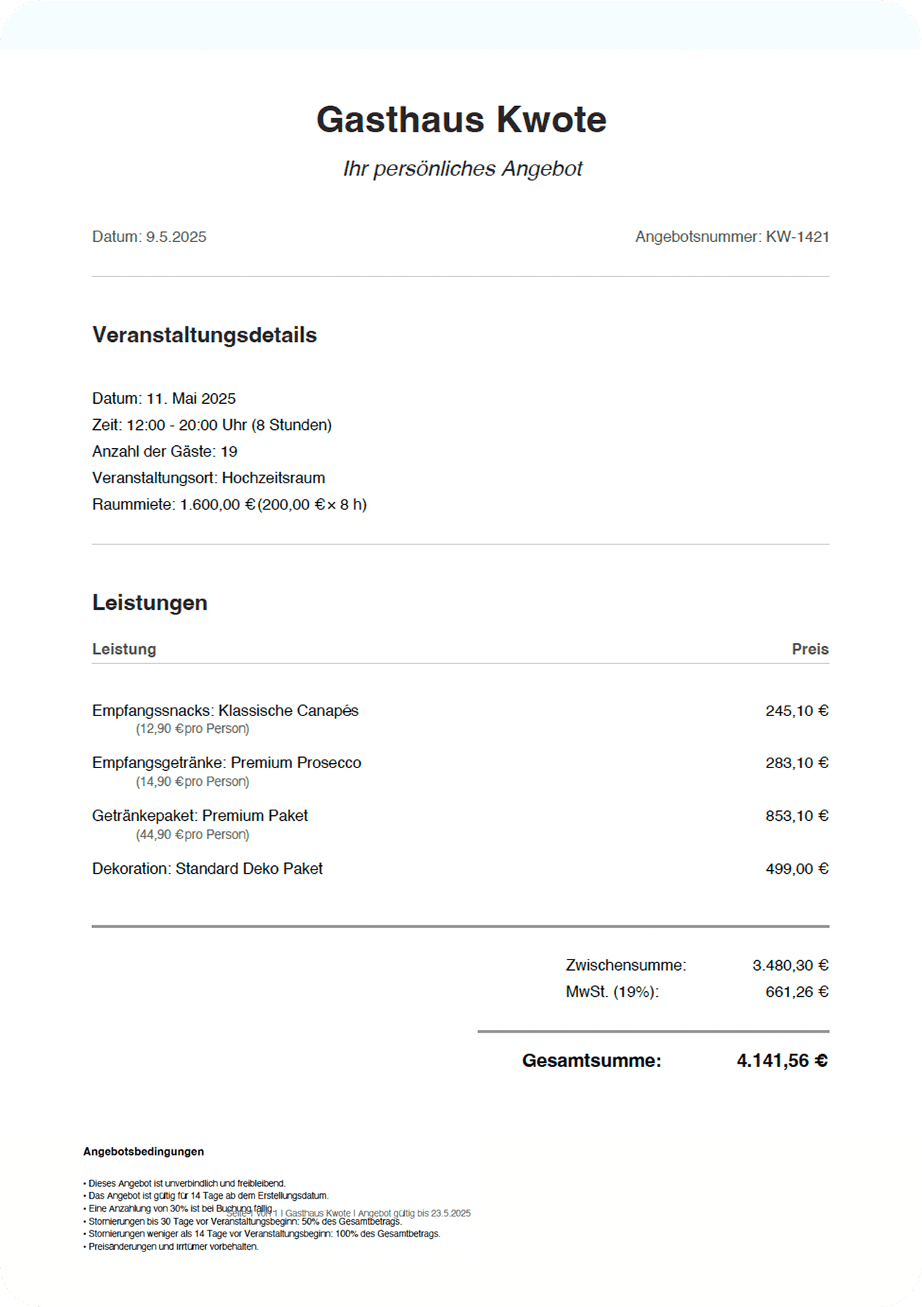 Angebote erstellen dauert lange, erfordert Rückfragen und kostet Zeit. Durch die Nutzung von Kwote wird nicht nur wertvolle und teure Arbeitszeit gespart, Kund:innen entscheiden sich auch schneller wenn ein konkretes Angebot vorliegt.